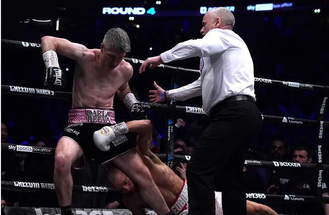 比赛是在英国曼彻斯特体育场举行的,这也是今天当地的主赛。赛前,小尤班克以1-3的赔率被看好。前面三个回合,两人打的总体势均力敌,不过第4回合利安-史密斯加强了进攻,先是一顿组合拳将小尤班克击倒一次。小尤班克被重创到了,站起来后有些腿软。史密斯接着一度组合拳继续穷追猛打,第二次击倒了小尤班克,裁判终止了比赛。