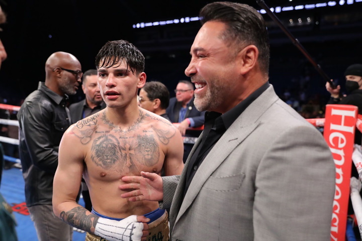 近日,前WBC轻量级过渡拳王美国“闪电侠”瑞恩-加西亚(23-0,19KO)的推广人德拉霍亚(39-6,30KO)向媒体表示,他相信瑞恩-加西亚能在4月15日KO现WBA轻量级普通拳王/三个级别的世界冠军美国“坦克”格沃塔-戴维斯(28-0,26KO)。