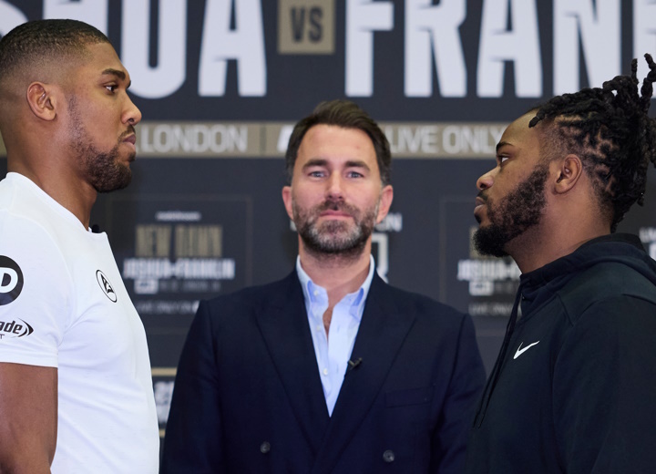 埃迪-赫恩说:“我相信约书亚Vs弗兰克林会是一场精彩的比赛。弗兰克林才和迪廉-怀特(21-1,14KO)打了一场恶战,展示了自己有多出色。而约书亚才遭遇2连败,大家对他有个大大的问号。我相信弗兰克林会告诉大家,现在的约书亚大概什么水平。如果约书亚这次输给弗兰克林,就不是世界顶级拳手了,再挑战世界拳王金腰带也难了。我认为弗兰克林是排名前15的拳手,如果约书亚要再次冲击世界拳王宝座,需要选择这样的对手。当然输给弗兰克林对于约书亚来说也不是世界末日,只是你要挑战拳王金腰带,会变的很难。”