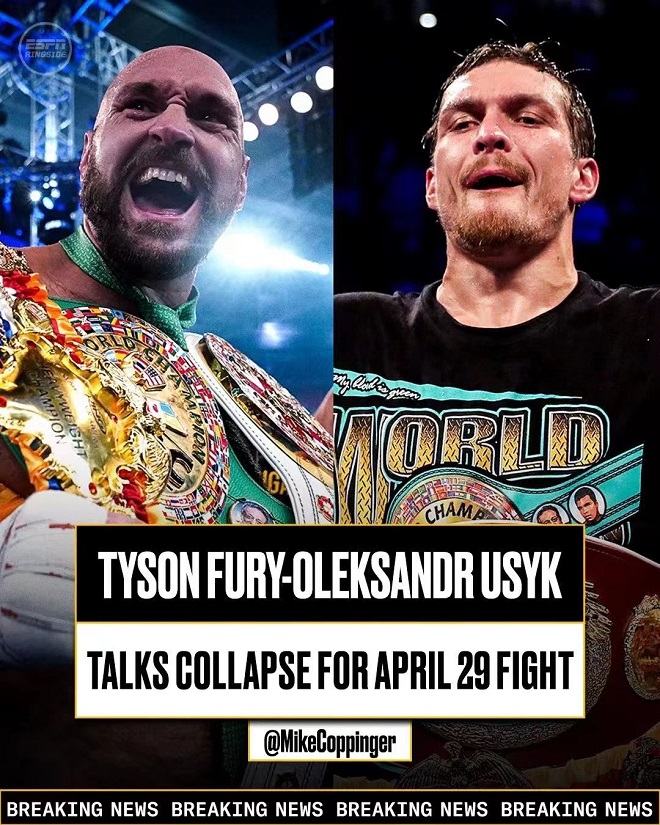 今天,ESPN拳击记者/专栏作家迈克-科平格向媒体透露,原定于4月29日现WBC重量级拳王泰森-富里(33-0-1,24KO)和WBA超级/IBF/WBO/IBO重量级拳王奥莱克桑德拉-乌西克(20-0,13KO)的统一战暂时取消了,双方团队还是无法达成一致。