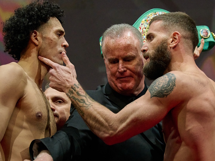本纳维德兹今天称重166.75磅,普朗特167.25磅,一次过关。普朗特在对视时还用手指了本纳维德兹的脸,两人差点爆发冲突。