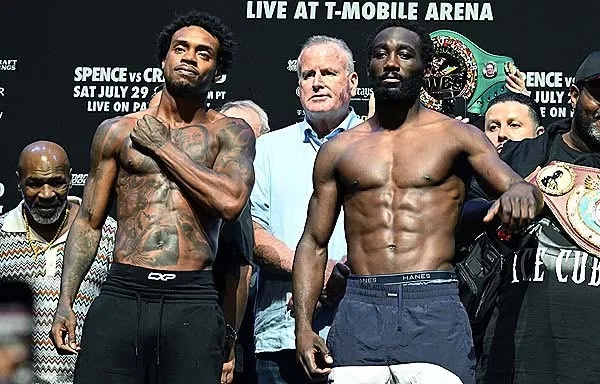 今天早些时候,现WBC/WBA超级/IBF/WBO次中量级拳王小埃罗尔-斯彭斯(28-0,22KO)和现WBO次中量级拳王/三个级别的世界冠军特雷恩斯-克劳福德(39-0,30KO)在美国拉斯维加斯米高梅大酒店举行了赛前称重仪式。北京时间7月30日中午,两人将进行一场预定为12个回合的次中量级拳王终极统一战。