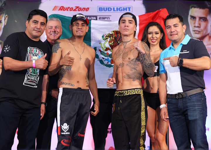 今天,现WBO次轻量级拳王/三个级别的世界冠军墨西哥人伊曼尼尔-纳瓦雷特(37-1,31KO)和前两个级别的世界拳王同胞奥斯卡-瓦尔德兹(31-1,23KO)在美国格兰岱尔沙漠钻石体育场举行了赛前称重仪式。北京时间8月13日上午,两人将进行一场预定为12个回合的次轻量级拳王争霸战,纳瓦雷特第一次卫冕WBO-130磅的世界拳王。纳瓦雷特今天称重130磅,奥斯卡-瓦尔德兹129.8磅,两人一次过关。