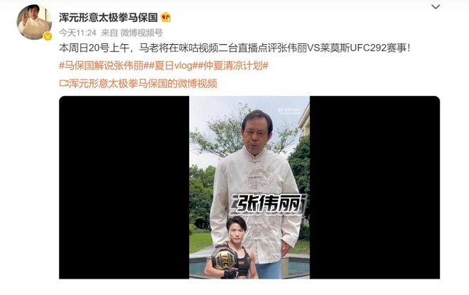 马保国表示:“中华大地,父老乡亲们,我们的小将张伟丽周日上午迎战莱莫斯,我对于这次的直播点评非常激动,非常兴奋,你们怎么看这场比赛。要从张伟丽勇往直前的精神、张伟丽的战术策略,张伟丽的功夫三个方面来看,周日抽出时间来支持我们的小将张伟丽,不见不散。”