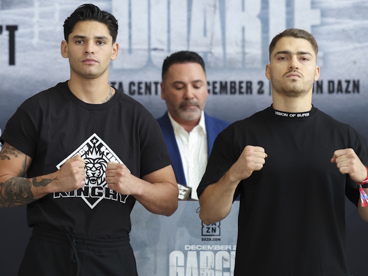 今天,前WBC轻量级过渡拳王美国“闪电侠”瑞恩-加西亚(23-1,19KO)和墨西哥重炮手奥斯卡-杜阿尔特(26-1-1,21KO)召开了赛前首次新闻发布会。北京时间12月3日,两人将在休斯顿进行一场预定为12个回合的超轻量级比赛,这也是瑞恩-加西亚自今年4月被格沃塔-戴维斯(29-0,27KO)7回合KO之后的首战。