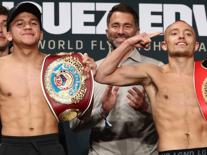 今天,现WBO蝇量级拳王/两个级别的世界拳王美国人杰西-罗德里格兹(18-0,11KO)和现IBF蝇量级拳王英国人萨尼-爱德华兹(20-0,4KO)在美国格兰岱尔沙漠钻石酒店举行了赛前称重仪式。北京时间12月17日上午,两人将进行IBF/WBO-122磅的拳王统一战。今天两人称重同为111.6磅,一次过关。