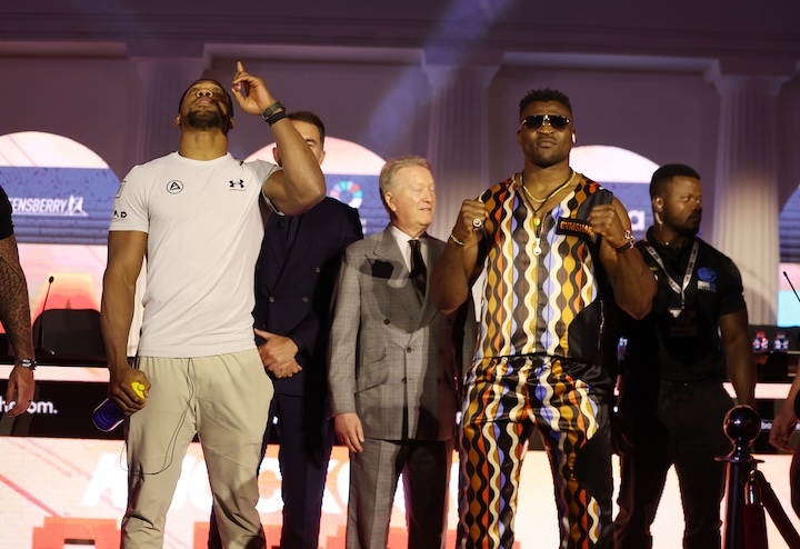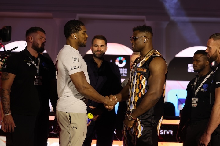 今天,前世界重量级拳王英国人安东尼-约书亚(27-3,24KO)和前UFC重量级冠军弗朗西斯-纳干诺(17-3,12K,4S)在沙特利雅得召开了赛前最后一次新闻发布会。北京时间3月9日早晨,两人将进行一场预定为10个回合的重量级无冕之战,这也是当晚DAZN直播的主赛。
