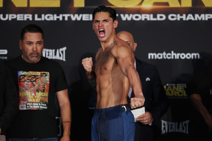 今天早些时候,前WBC轻量级过渡拳王“闪电侠”瑞恩-加西亚(24-1,20KO)和德文-哈尼(31-0,15KO)在布鲁克林巴克莱中心进行了赛前称重仪式。瑞恩-加西亚称重143.2磅,而且走上磅秤前,他还特意大喝了一瓶啤酒,似乎是在炒作。不过即便他不喝这瓶啤酒,体重也不会控制在140磅以内。按照赛前协议,超重1磅罚款50万美元,瑞恩-加西亚将拿出150万美元。