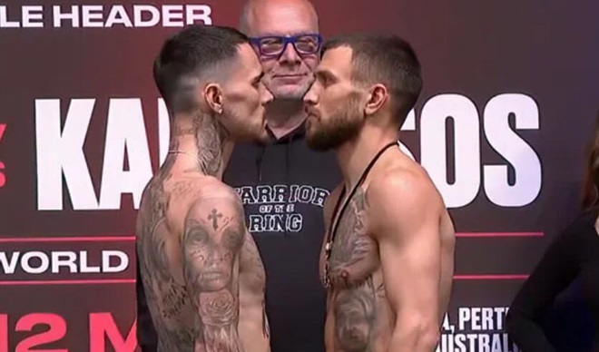 今天,前三个级别的世界拳王/两度奥运会冠军乌克兰人瓦西里-洛马琴科(17-3,11KO)和前WBA/IBF/WBO轻量级拳王澳大利亚人小乔治-坎伯索斯(21-2,10KO)在澳大利亚珀斯RAC体育场进行了赛前称重仪式。