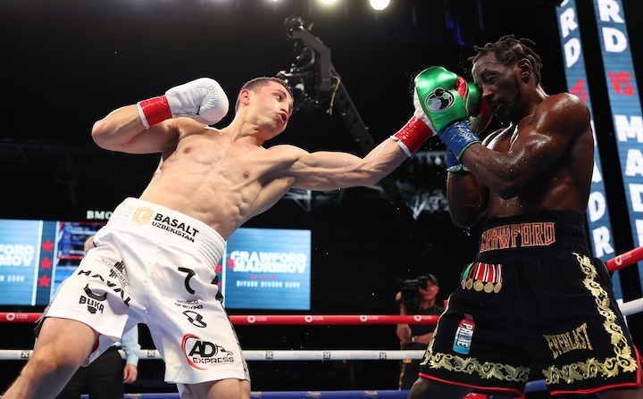 昨天中午,乌兹别克斯坦名将马德里莫夫(10-1-1,7KO)和特雷恩斯-克劳福德(41-0,31KO)大战12回合,最终以112-116、113-115、113-115的点数告负,丢掉了WBA超次中量级拳王金腰带。