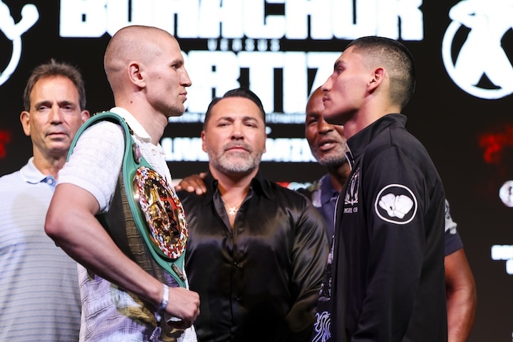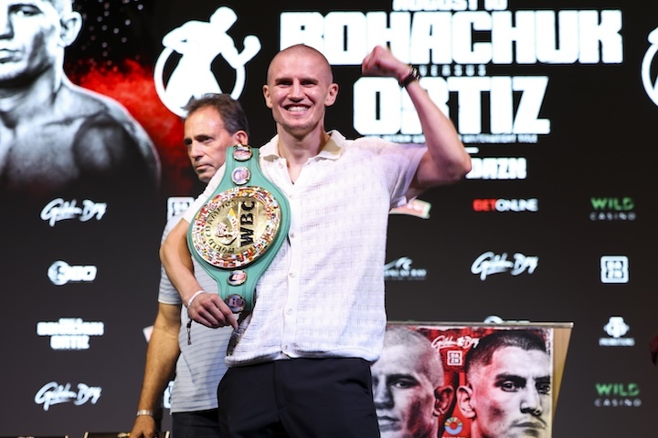 今天,美国超次中量级新秀小维吉尔-奥提兹(21-0,21KO)和现WBC超次中量级过渡拳王乌克兰人塞瑞尔-博哈楚克(24-1,23KO)在拉斯维加斯曼达莱湾大酒店召开了赛前最后一次新闻发布会。北京时间8月11日(周日)中午,两人将进行一场预定为12个回合的超次中量级比赛,博哈楚克卫冕WBC-154磅的过渡拳王。现在最新赔率是1-3,小奥提兹略被看好。