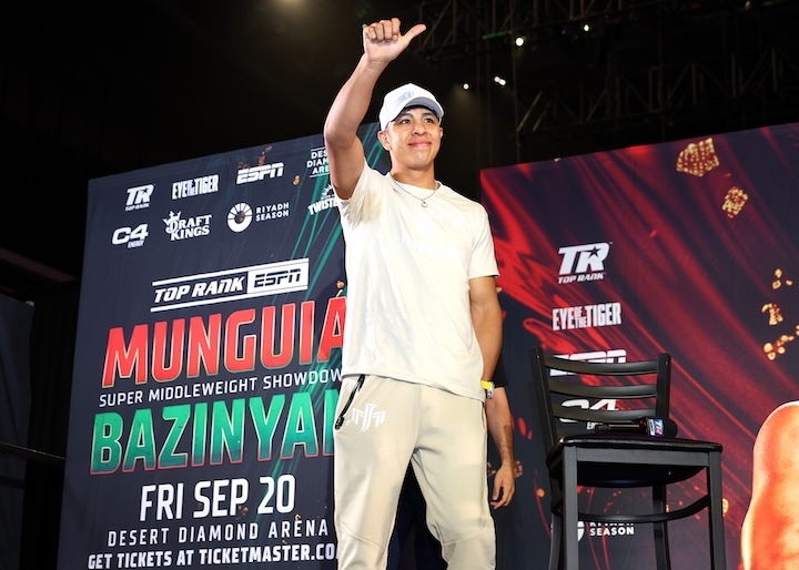 今天,前WBO超次中量级拳王墨西哥人加梅-蒙圭亚(43-1,34KO)和亚美尼亚裔加拿大不败新秀埃里克-巴兹尼安(32-0-1,23KO)在美国格兰岱尔沙漠钻石酒店举行了赛前称重仪式。北京时间周六上午,两人将进行一场预定为12个回合的超中量级比赛,争夺WBO-168磅的国际拳王金腰带。蒙圭亚今天称重167.7磅,对手167.9磅,均一次过关。