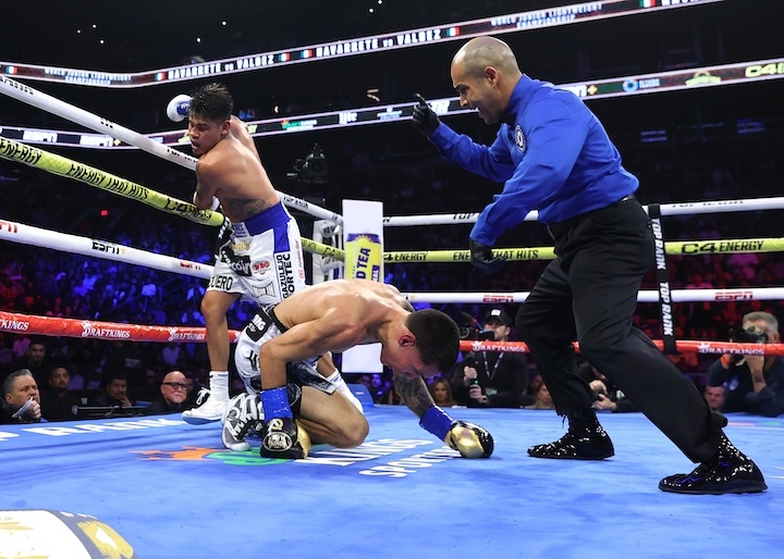 在今天中午结束的一场次轻量级拳王争霸战中,现WBO卫冕拳王/三个级别的世界冠军墨西哥人伊曼尼尔-纳瓦雷特(39-2-1,32KO)6回合三次击倒了前两个级别的世界拳王墨西哥同胞奥斯卡-瓦尔德兹(32-3,24KO),第三次成功卫冕WBO-130磅的世界拳王金腰带。