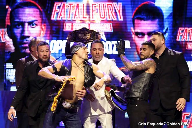 今天,现WBO超轻量级拳王/两个级别的世界冠军美国人特奥菲莫-洛佩兹(21-1,13KO)和WBO-140磅过渡拳王小阿诺德-巴博萨(32-0,11KO)召开了赛前首次新闻发布会。两人将于北京时间5月3日开战,这也是瑞恩-加西亚Vs罗梅洛主赛前的一场垫赛。洛佩兹在面对面环节出手扇了巴博萨一巴掌,两人被及时拉开。
