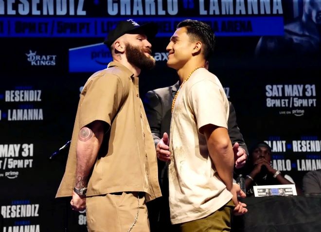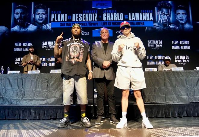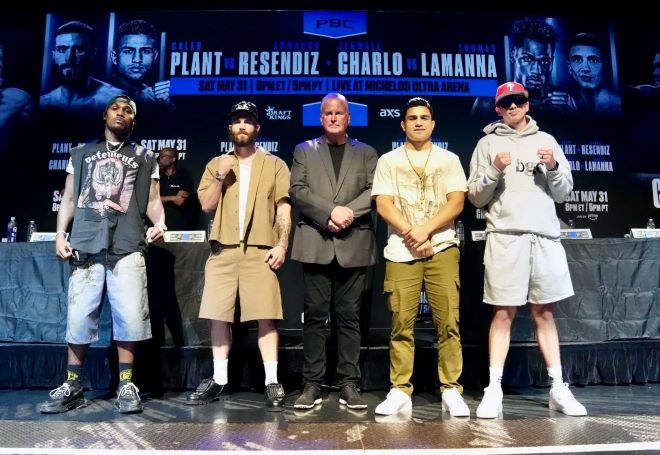 今天,现WBA超中量级过渡拳王卡勒伯-普朗特(23-2,14KO)、前世界超次中量级/中量级拳王吉玛尔-查洛(33-0,22KO)、墨西哥拳手何塞-阿曼多-雷森迪兹(15-2,11KO)、美国人托马斯-拉曼纳(39-5-1,18KO)在洛杉矶召开了新闻发布会。北京时间6月1日上午,普朗特将对阵雷森迪兹,吉玛尔-查洛将对阵拉曼纳,如果两人双双取胜将在下半年大战。