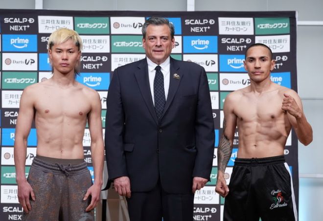 北京时间4月10日下午,前世界蝇量级/超蝇量级拳王墨西哥硬汉胡安-埃斯特拉达(45-4,28KO)和日本“格斗神童”那须川天心(7-1,2KO)在日本国技馆进行了赛前称重仪式。北京时间4月11日晚,两人将进行一场预定为12个回合的WBC最轻量级拳王资格淘汰赛。埃斯特拉达昨天称重117.5磅,那须川天心118磅,一次过关。