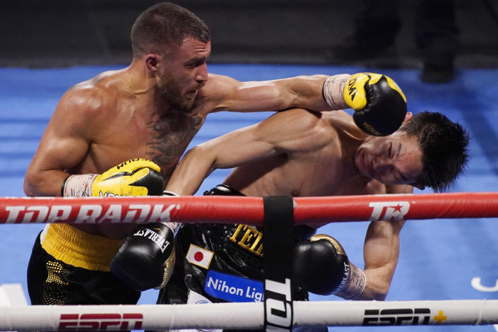 资料:这是 2021 年 10 月 16 日举行的一场羽量级拳王争霸战中,由现 WBO 卫冕拳王 / ...