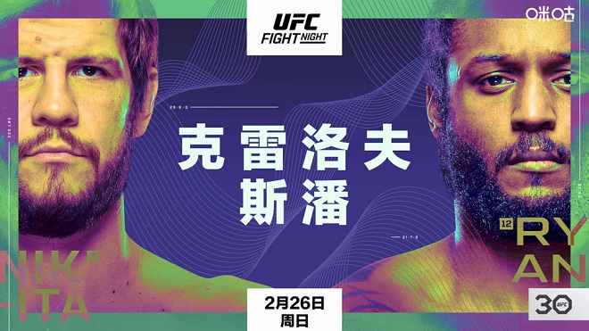 UFC格斗之夜:克雷洛夫 VS 斯潘将于北京时间2月26日在拉斯维加斯UFC APEX内举行。本次赛事一共包括了5场主赛和8场副赛总共13场比赛。咪咕将于26日05点开始全程直播整场赛事。