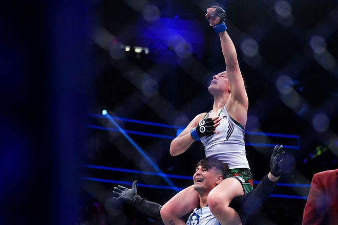亚历克莎-格拉索(Alexa Grasso)在UFC285中把自己的名字留在了UFC历史上,她在与瓦伦蒂娜-舍甫琴科(Valentina Shevchenko)的女子蝇量级冠军战中于第四回合裸绞降服获胜,终结了对手连续7次成功卫冕的冠军统治。