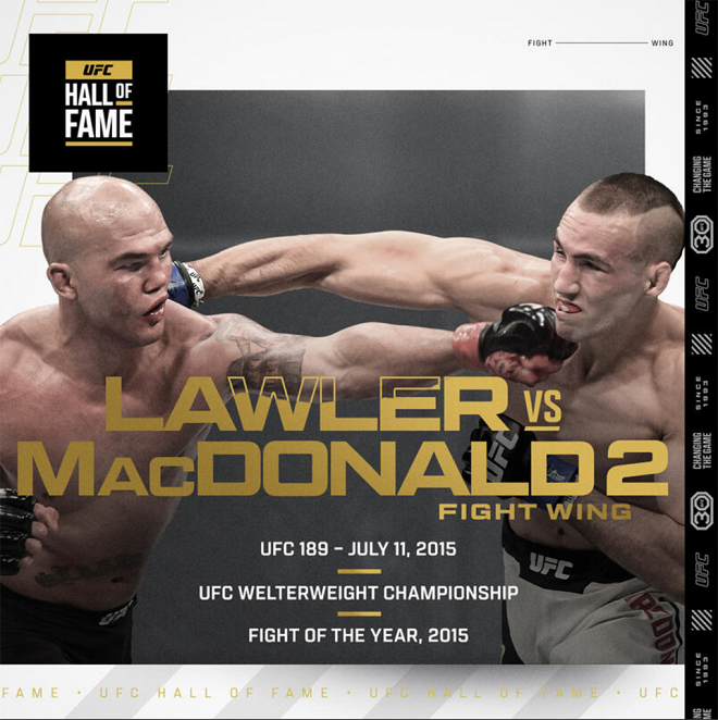 UFC日前宣布将罗比-劳勒(Robbie Lawler)与洛里-麦克唐纳德(Rory MacDonald)在2015年进行的次中量级冠军二番战引入2023年UFC名人堂的“经典对决”单元。2023年UFC名人堂仪式将作为第11届“UFC国际格斗周”的一部分于7月6日在拉斯维加斯T-Mobile Arena举行,并将通过UFC FIGHT PASS独家直播。