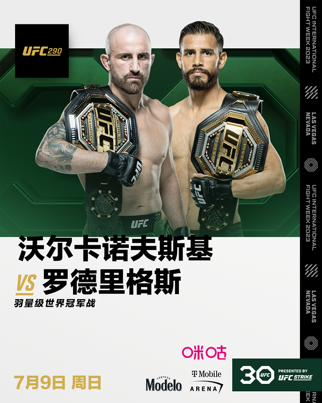 UFC290:沃尔卡诺夫斯基 VS 罗德里格兹将于北京时间7月9日在拉斯维加斯T-Mobile举行,当晚还将进行布兰登-莫雷诺(Brandon Moreno) VS 亚历山大-潘托加(Alexandre Pantoja)的蝇量级冠军战。咪咕届时将全程直播整场赛事。